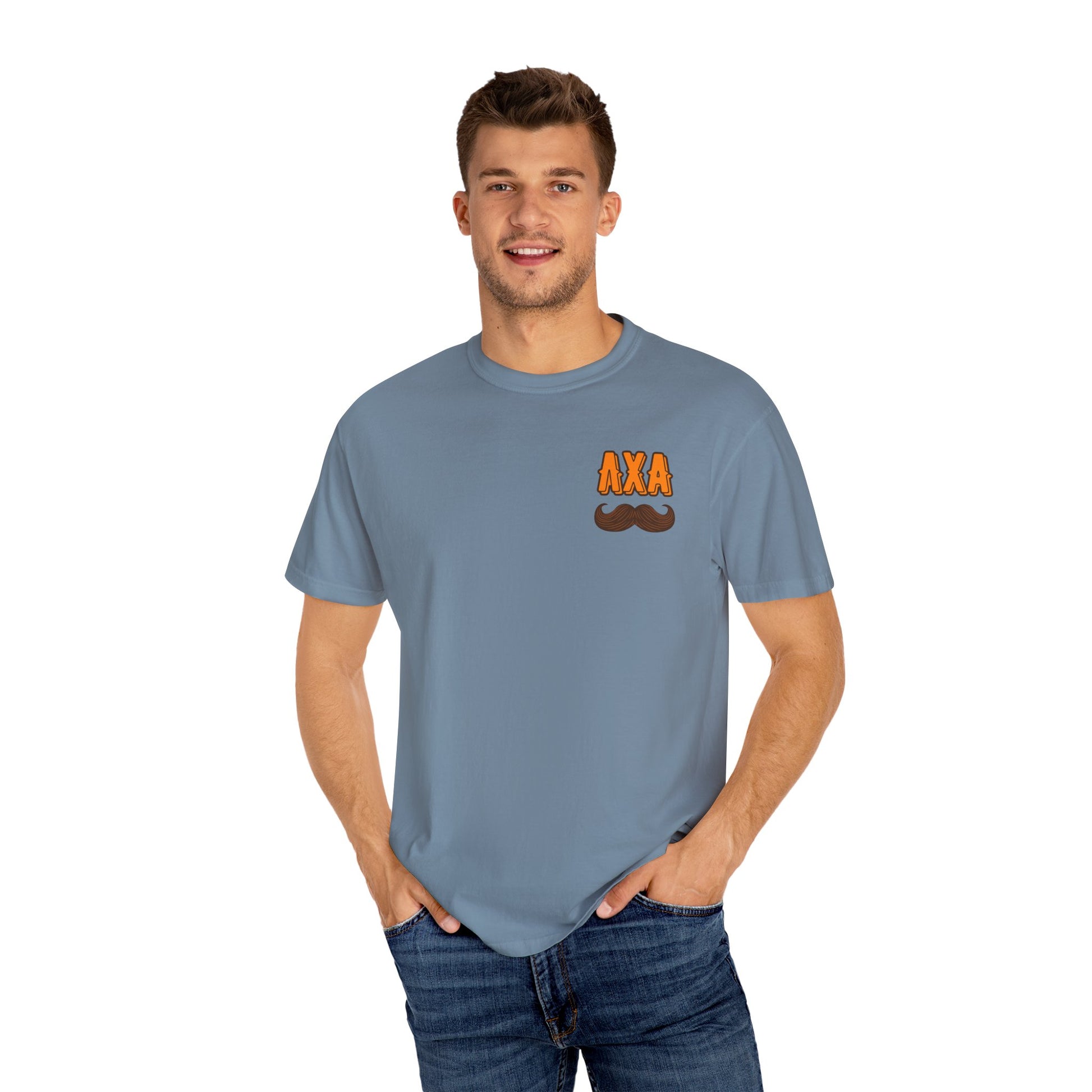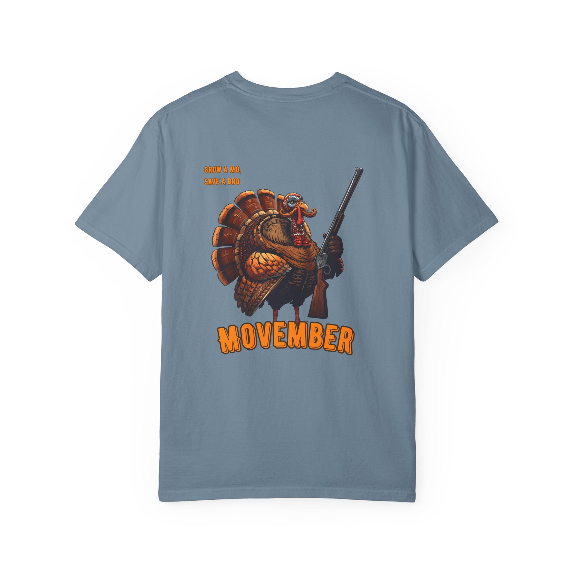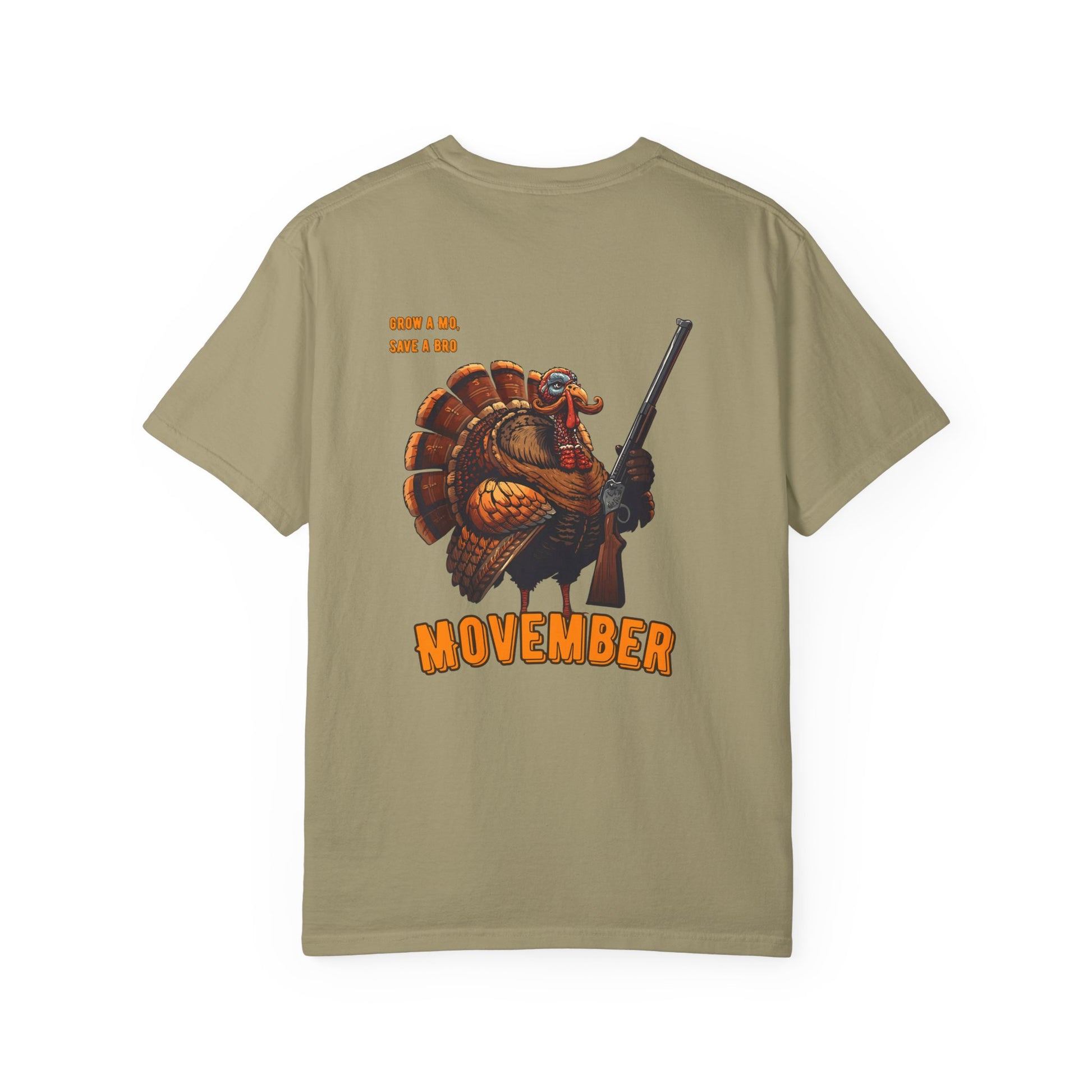 This shirt is designed to raise funds for Movember, a global movement in November that raises awareness and funds for men's health, specifically addressing prostate cancer, testicular cancer, and mental health and suicide prevention. The most well-known tradition is "growing a Mo" (mustache), but participants can also run or walk 60 miles for men lost to suicide every hour, or develop their own way to raise funds. Funds raised support research, treatment, and support solutions for men's health issues.